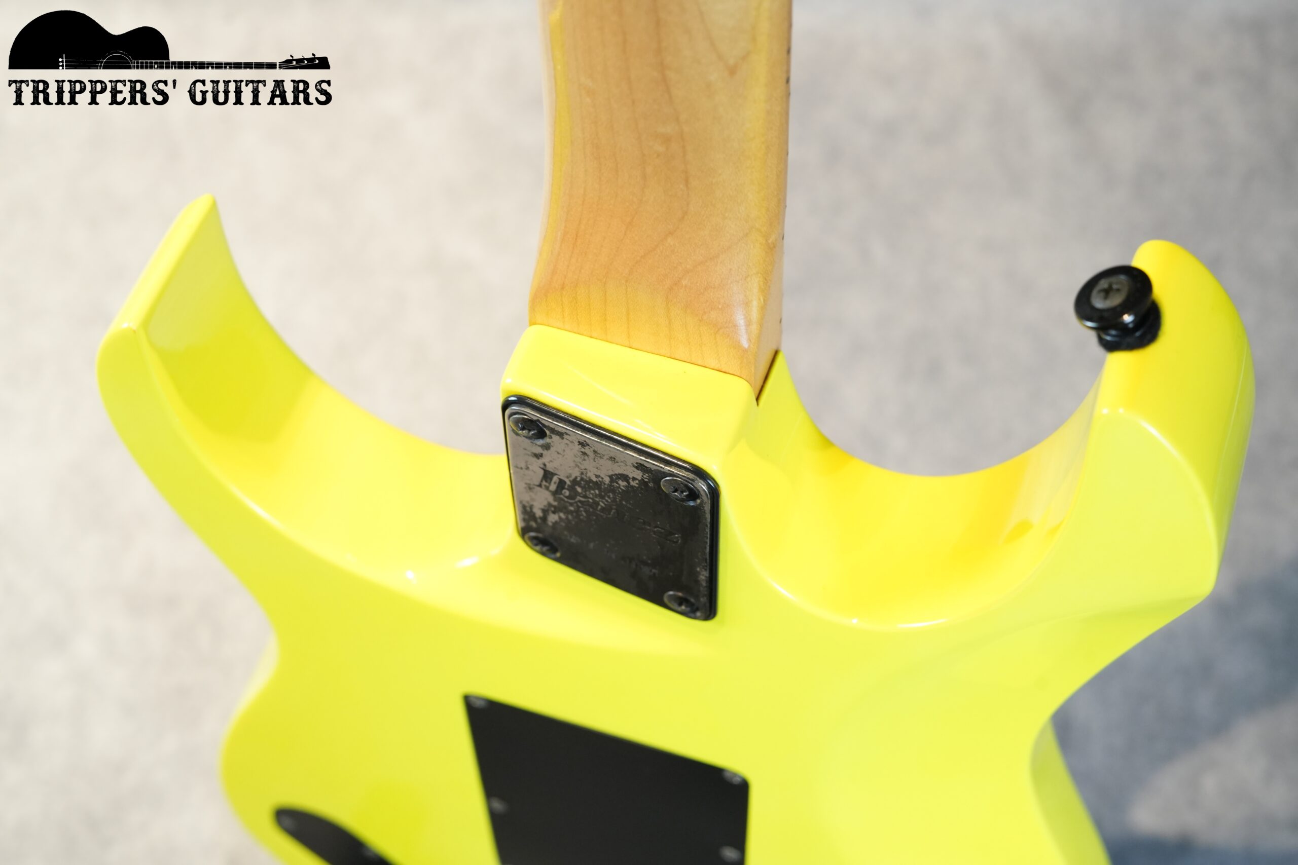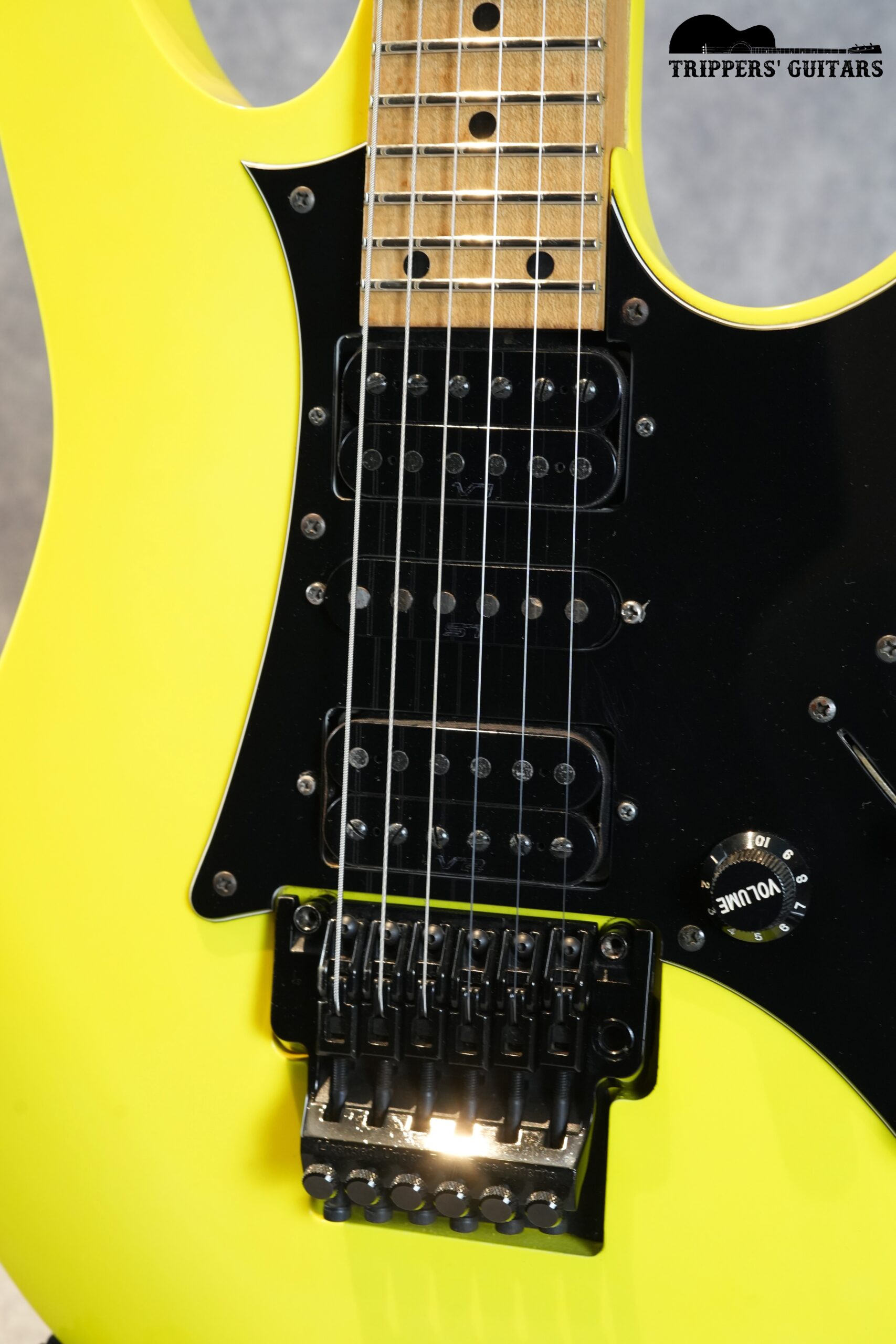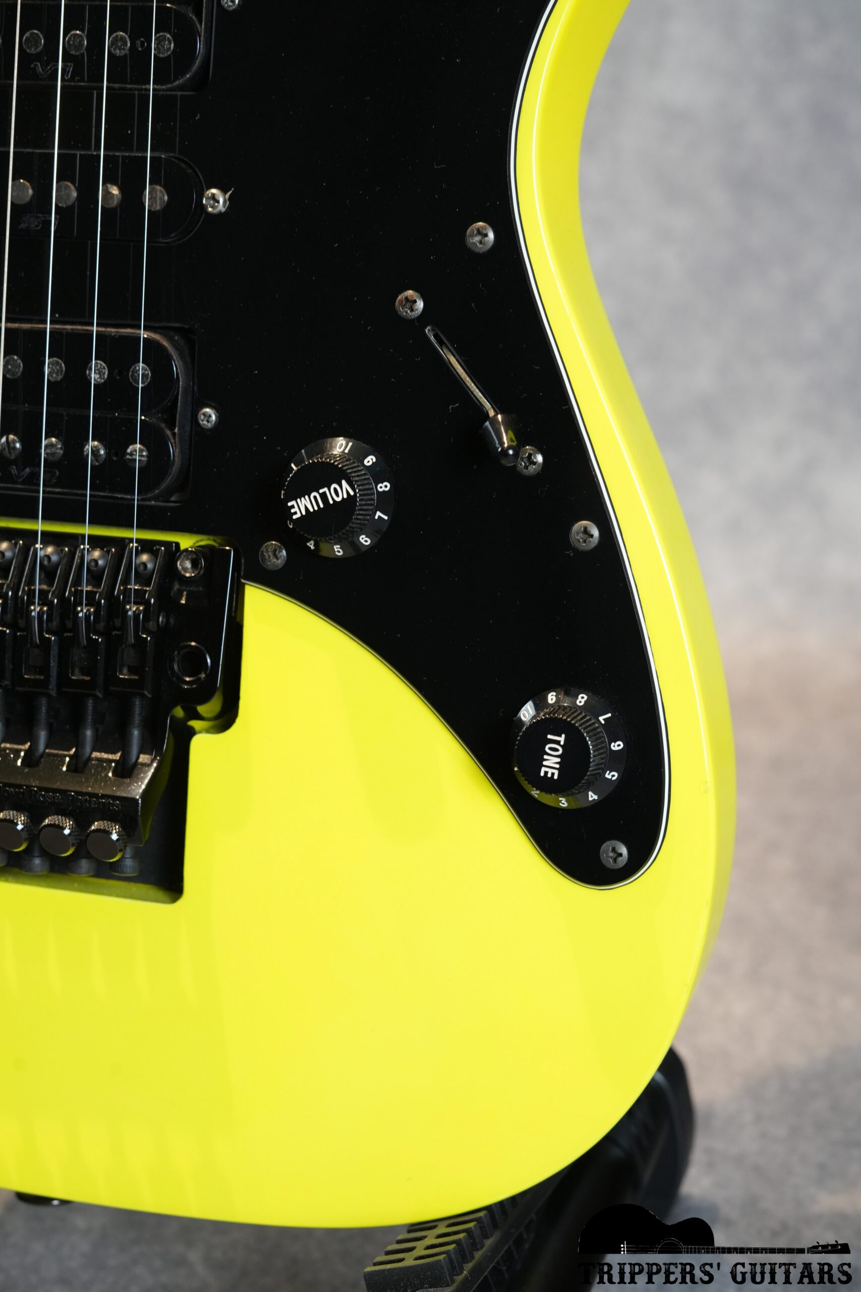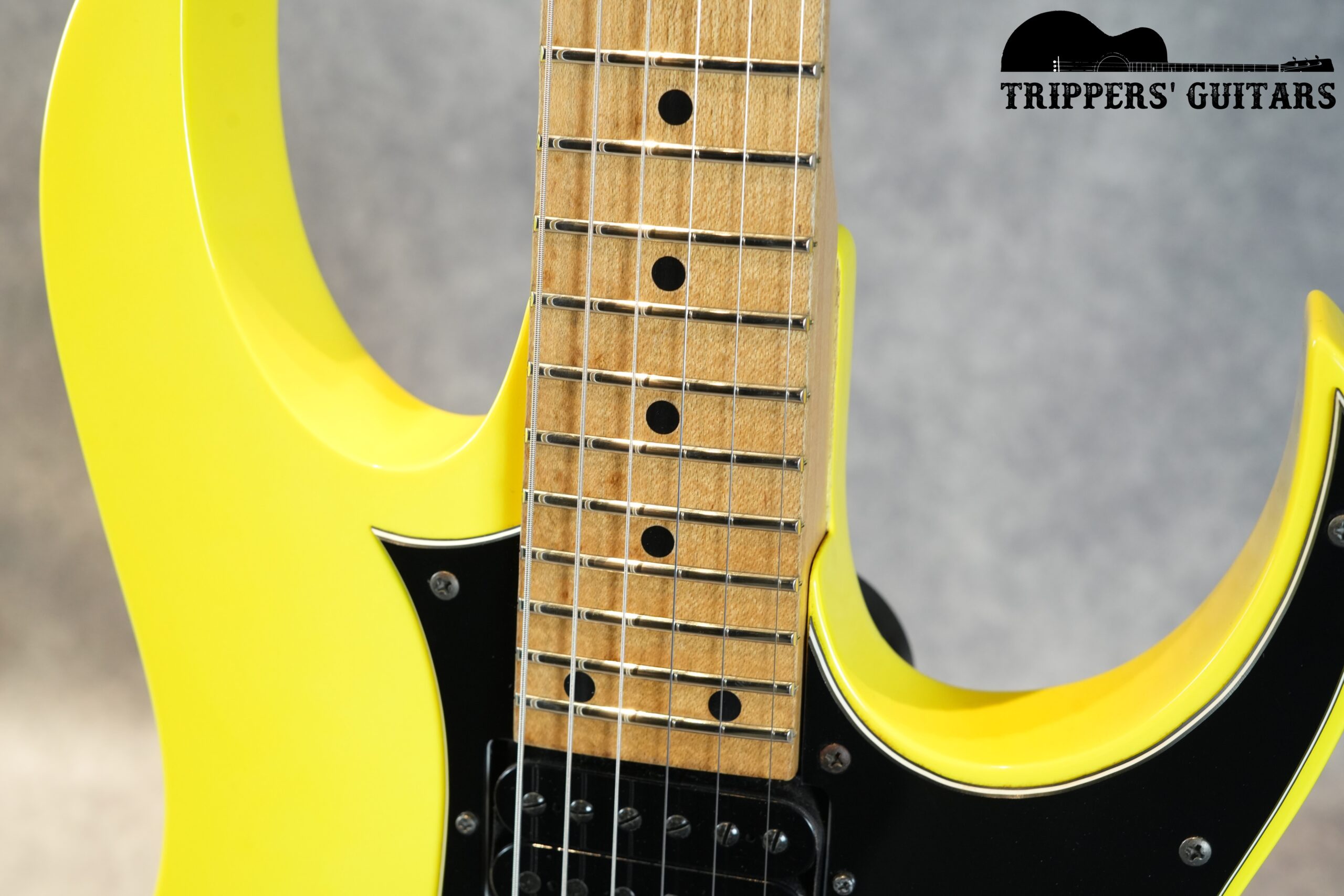 ヘッドも同じ黄色いカラーで、黒のIbanezロゴ。