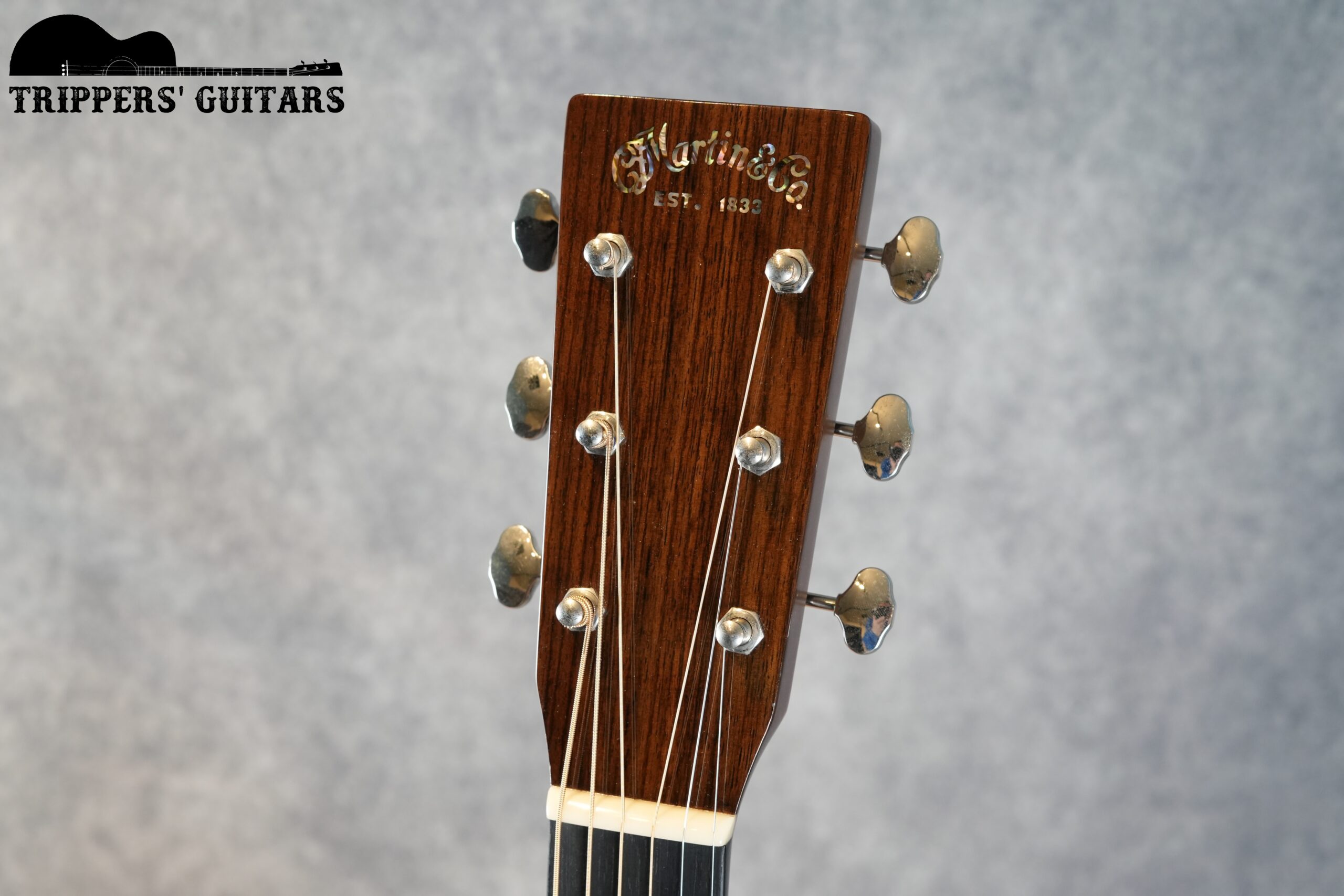 インディアンローズウッドのヘッドプレートにアバロンが使われたロゴ。