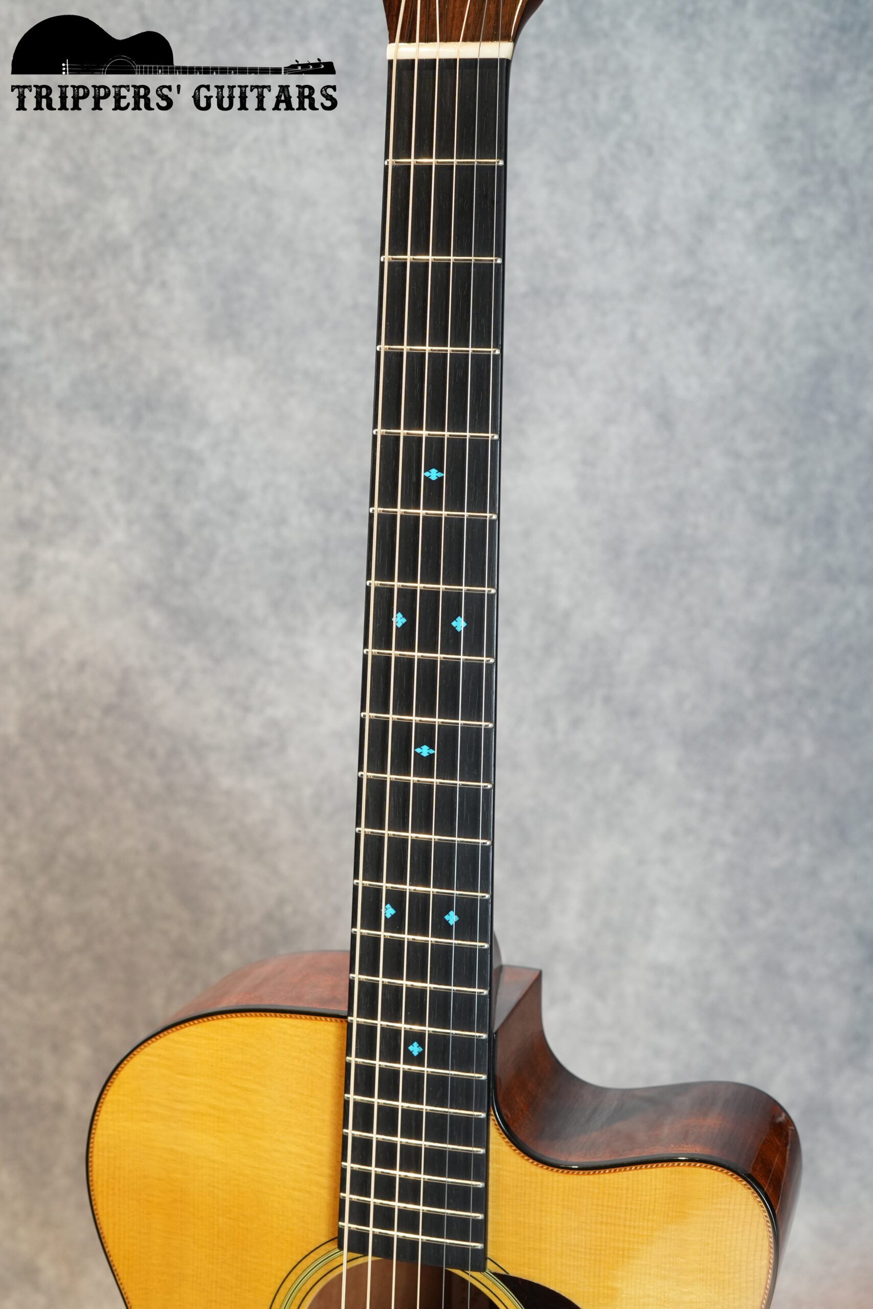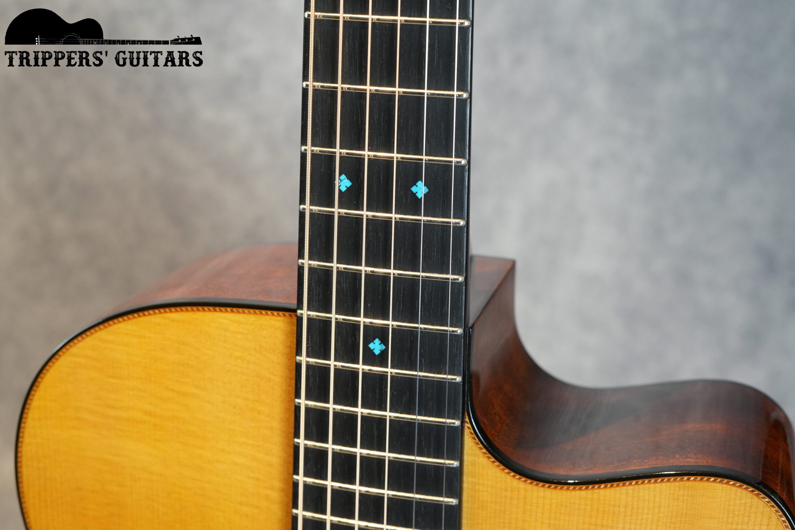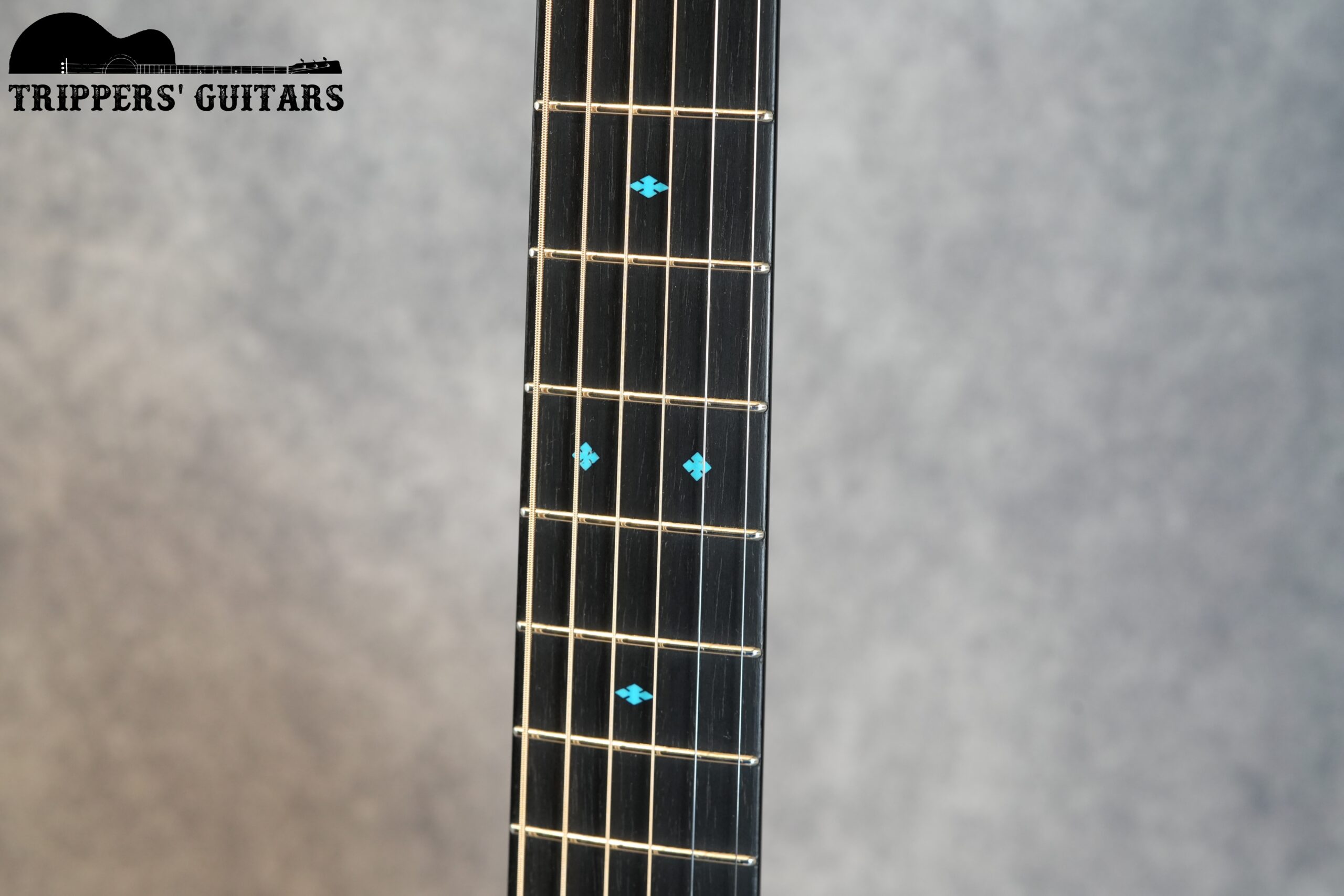 ポジションマークのインレイはアバロンではなく、ターコイズが使われており、美しいブルーカラーです。