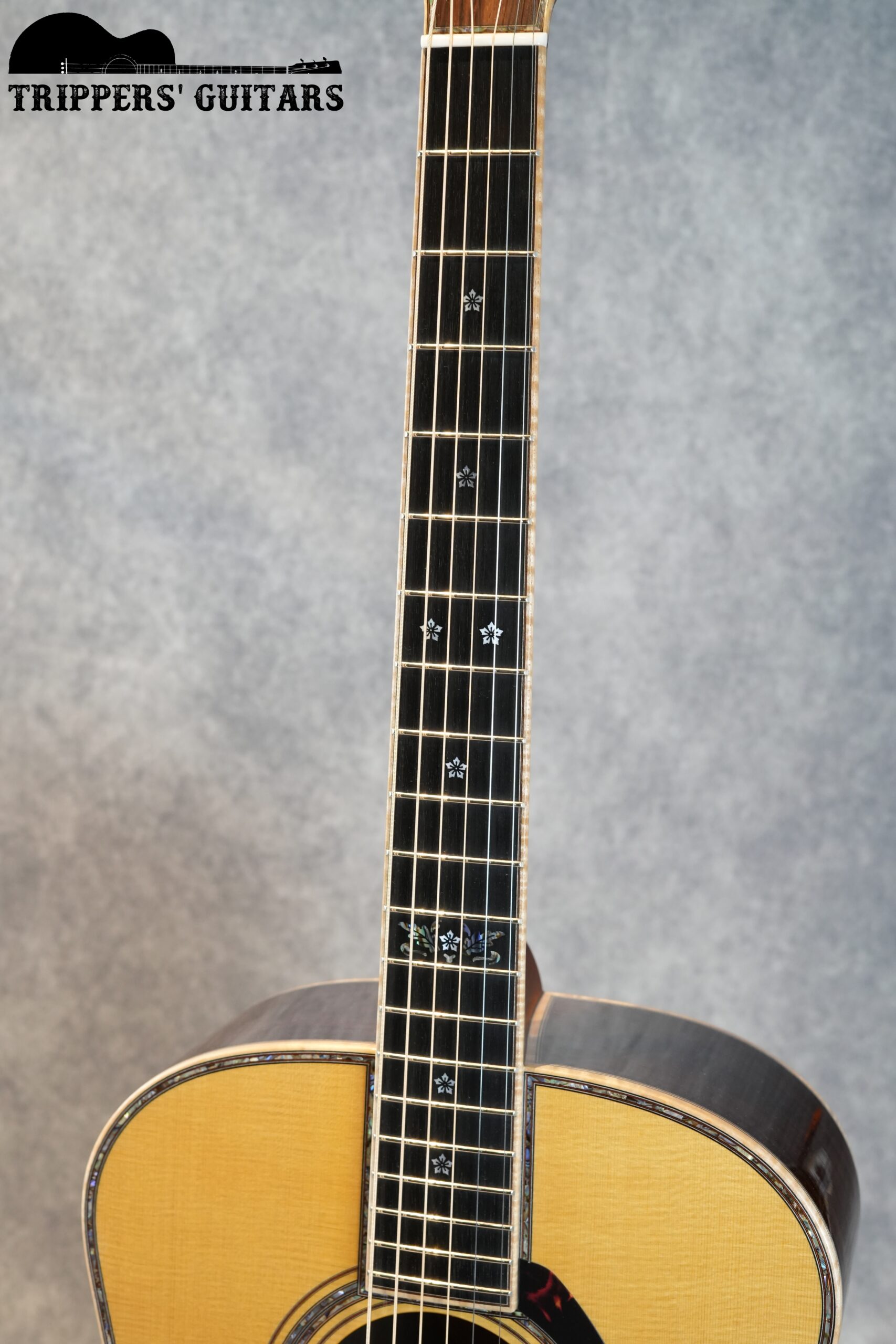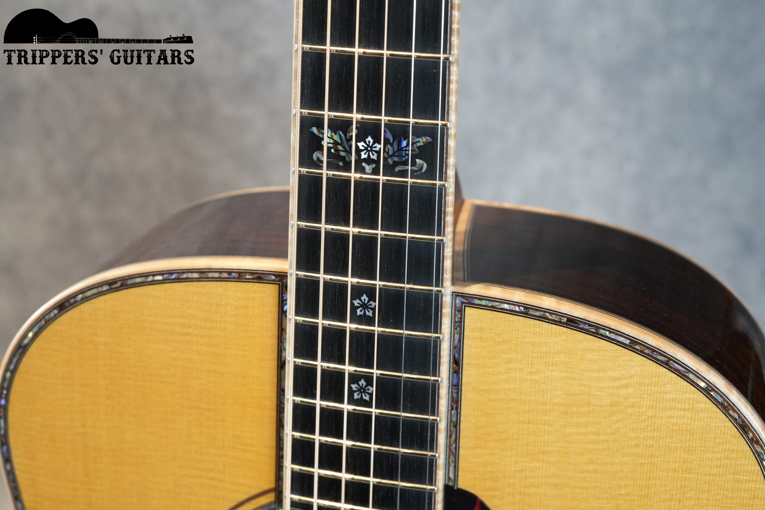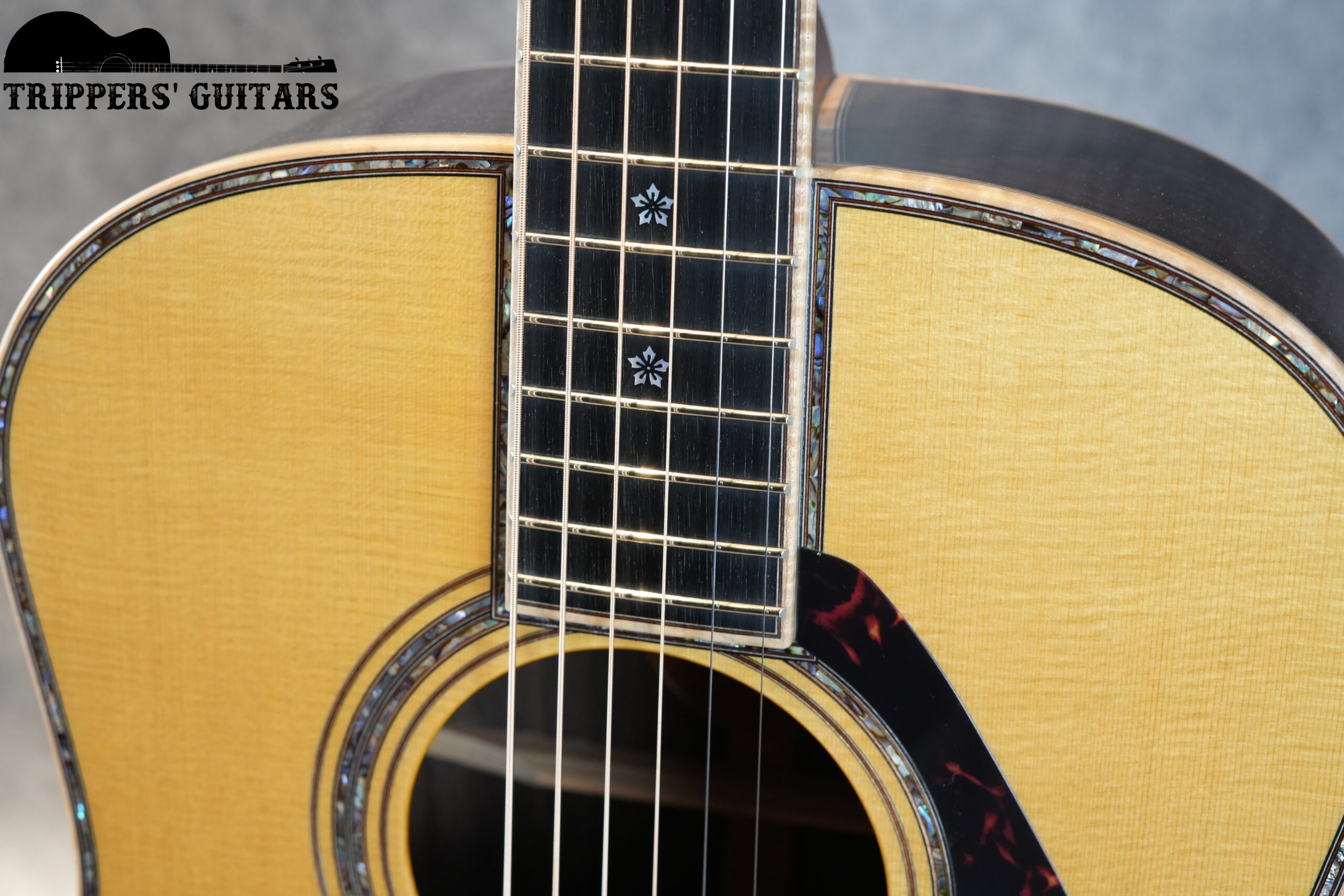 ロゼッタにはダブルアバロンが使われ、ピックガードはオリジナルシェイプの鼈甲柄。