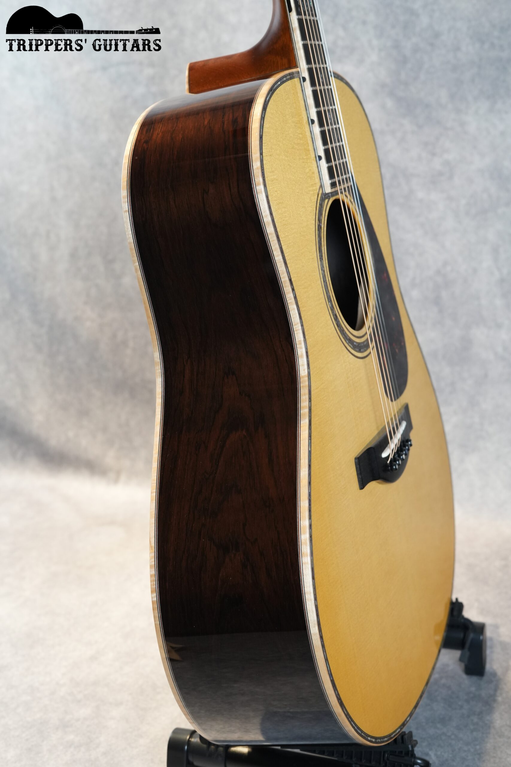 ボディトップの外周とネック脇、そしてボディバックにもアバロントリムが入り、バインディングはフィギュアドメイプルの仕様です。